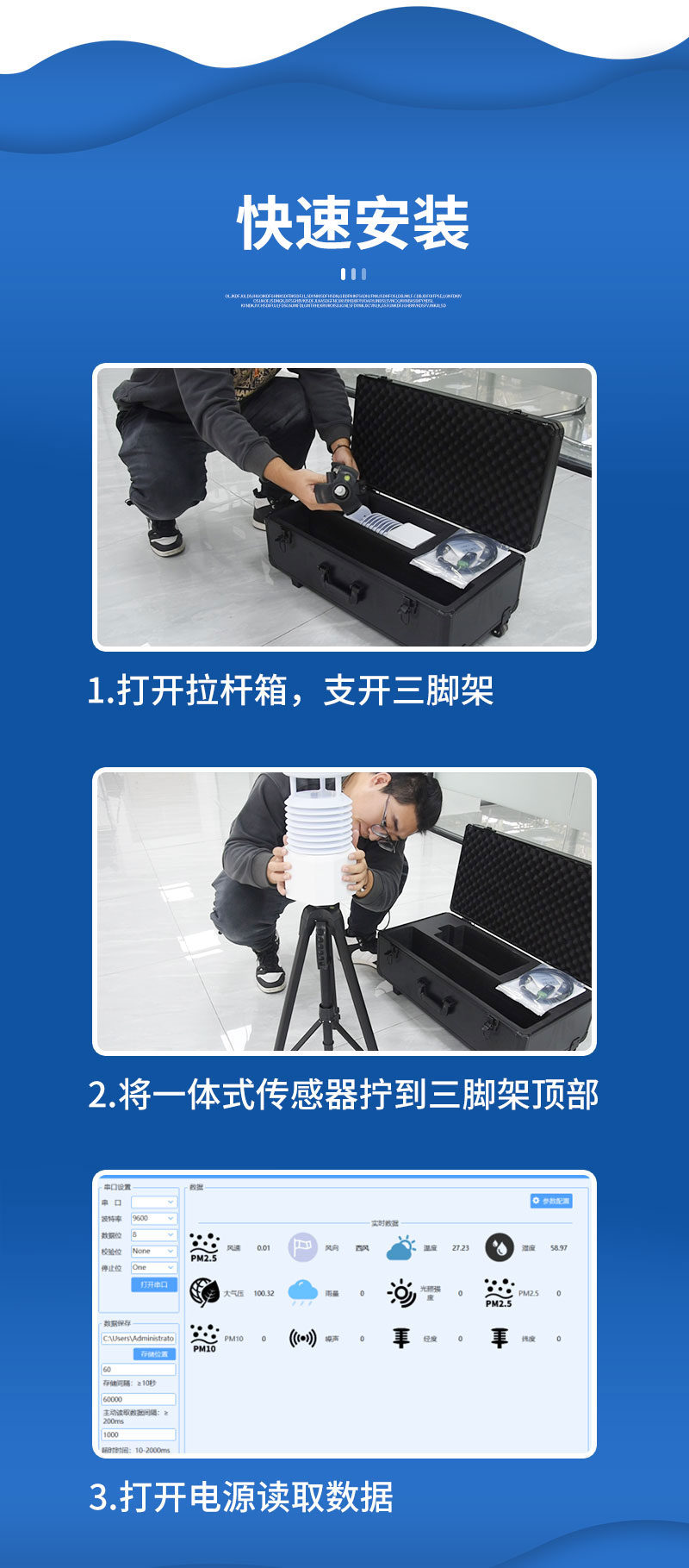 【产品简介】一、便携式气象观测仪产品简介BQX2便携式气象观测仪是一款高度集成、低功耗、可快速安装、便于野外监测使用的高精度自动气象观测设备。该设备支持有线、蓝牙、GPRS等传输方式,免调试,···