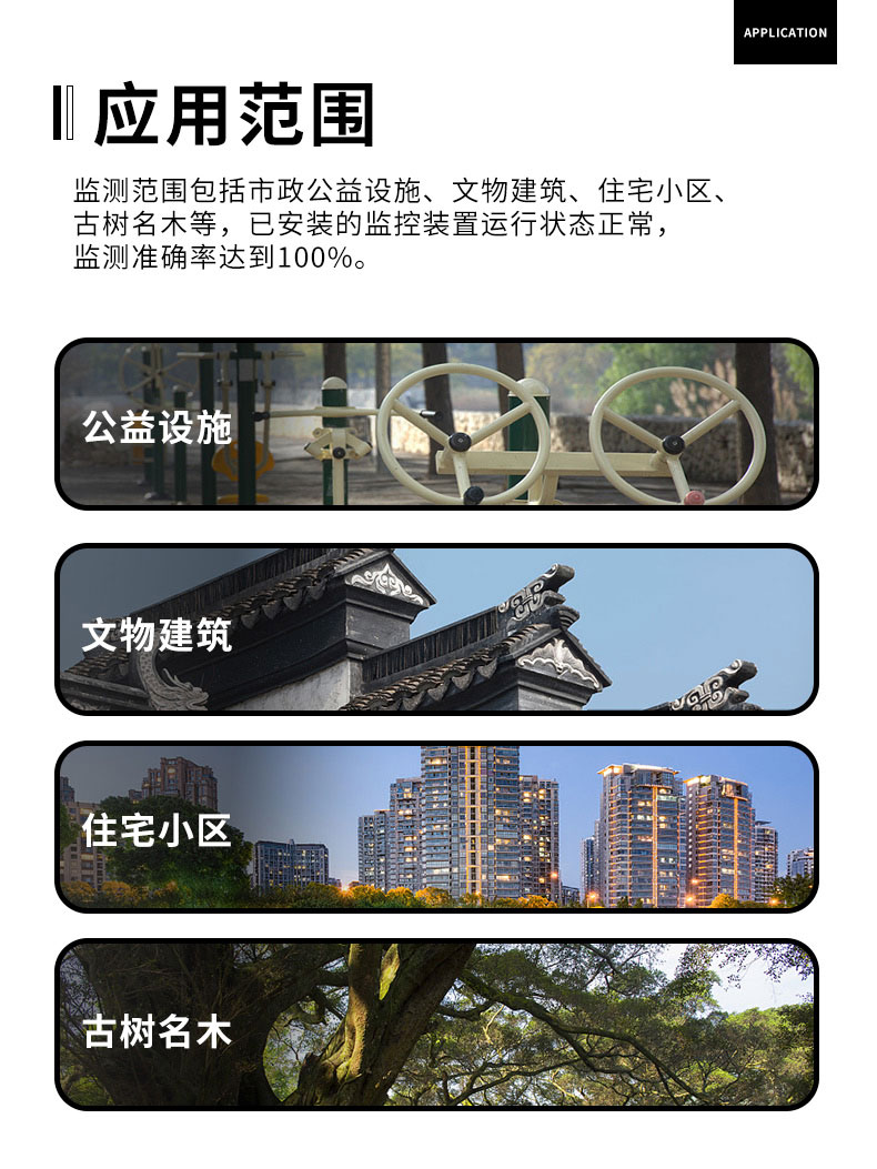 监测范围包括市政公益设施、文物建筑、住宅小区、古树名木等,已安装的监控装置运行状态正常,监测准确率达到100%。