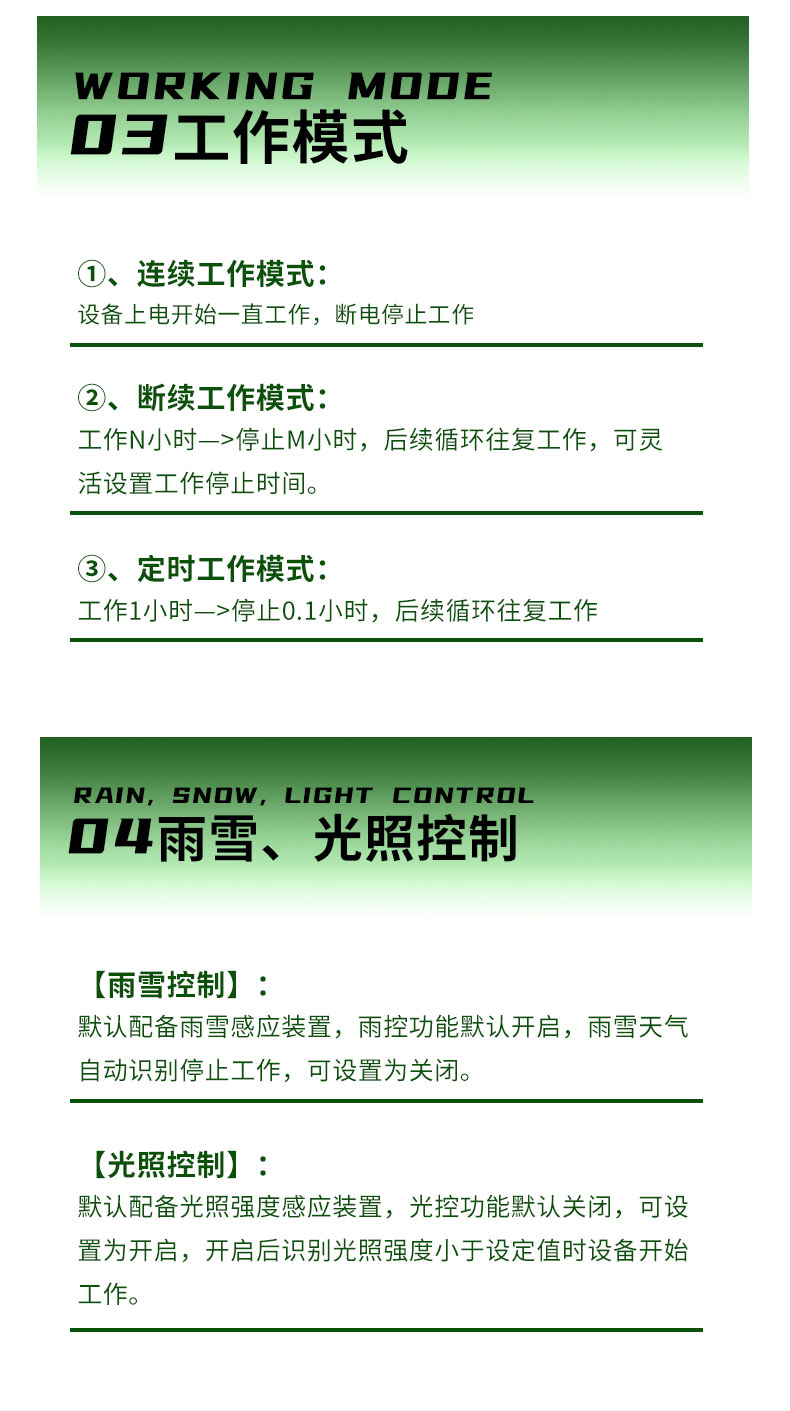 光照控制:默认配备光照强度感应装置,光控功能默认关闭,可设置为开启,开启后识别光照强度小于设定值时设备开始工作。