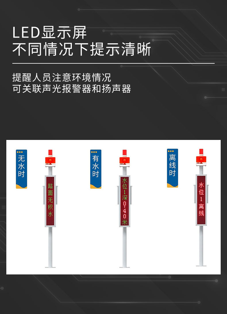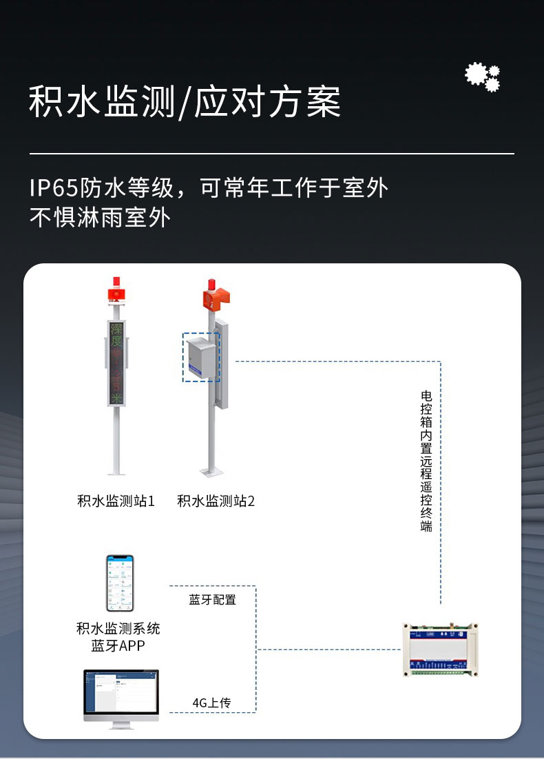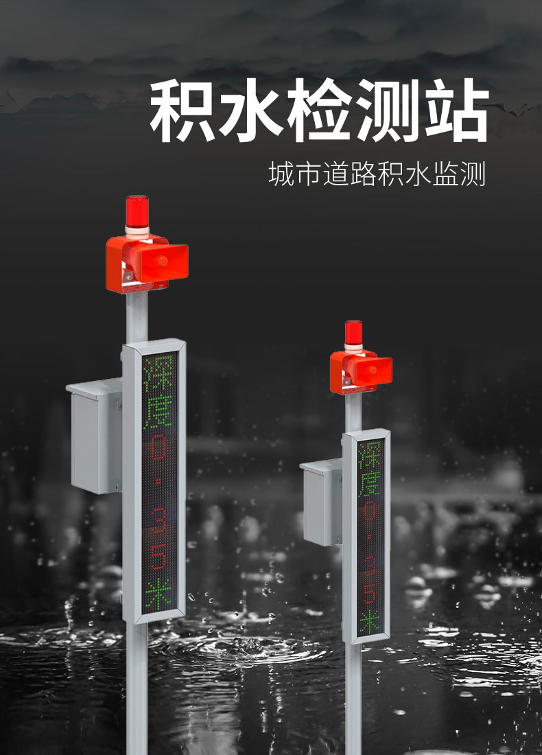 该系统由监测主机、立杆支架、供电系统、地埋式积水监测站、LED双色显示屏以及云平台组成,主要为城市道路、地面、隧道、立交等容易积水的场合提供实时监测及预警服务。