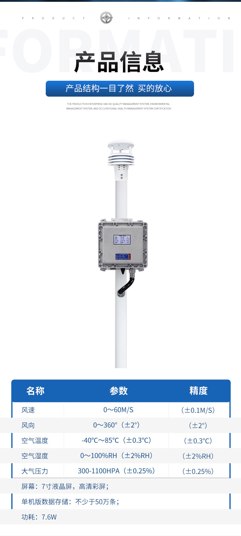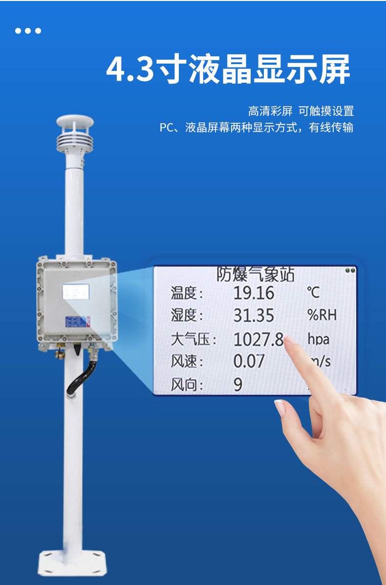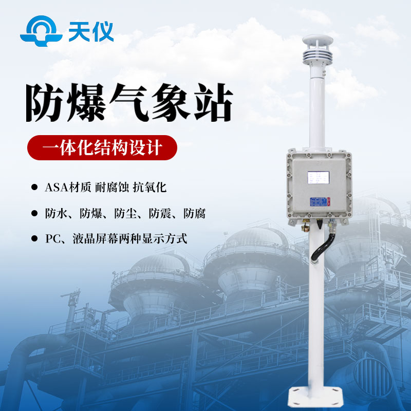 此款液晶屏防爆气象站采用了防腐、防爆、防水、防震、防尘等高防护等级的设计理念,可满足化工厂、油库、隧道、矿井等场景的使用需求。