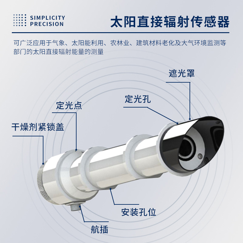 太阳直辐射传感器可以用来测量光谱范围为0.28-3μm太阳直接辐射强度。辐射传感器的核心器件是高精度感光元件,精准直筒优化设计,稳定性好、精度高;同时在感应元件外安装了由精密光学冷加工磨制而成的石英玻璃片,在石英玻璃片安装筒前端装有遮光罩,有效防止了环境因素对传感器性能的影响;干燥剂锁紧盖设有圆形玻璃观察窗,内置变色硅胶干燥剂,便于观察干燥剂吸水情况。