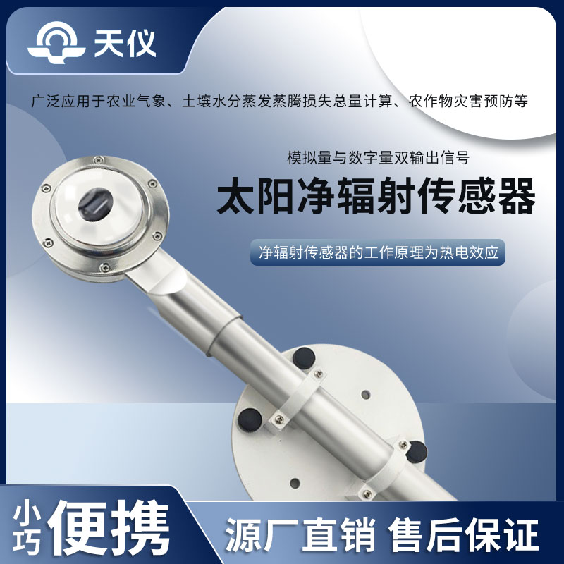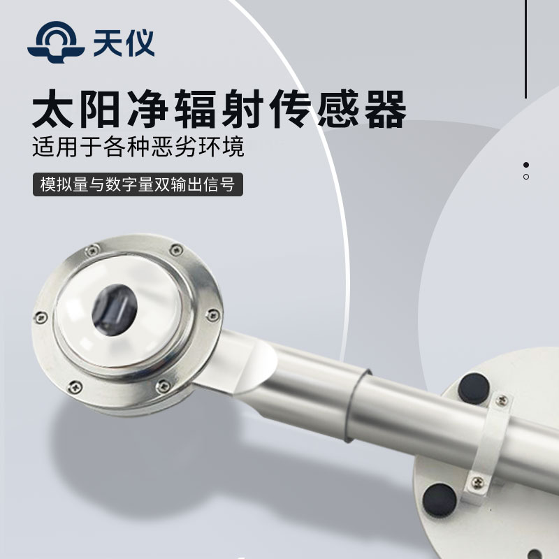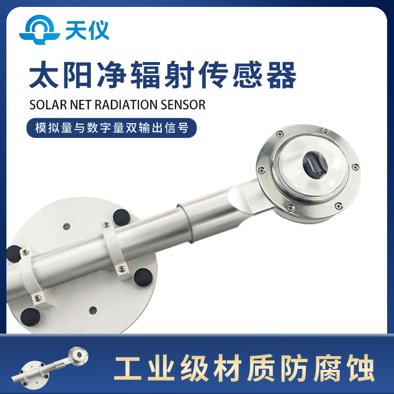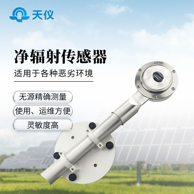 太阳净辐射传感器被用来测量由天空向下投射的和地球表面向上投射的全波段辐射量的净差值。测量范围为0.3~3微米的短波辐射和3~100微米的地球辐射。应用于土壤水分蒸发蒸腾计算、及热平衡相关的建筑机理研究。