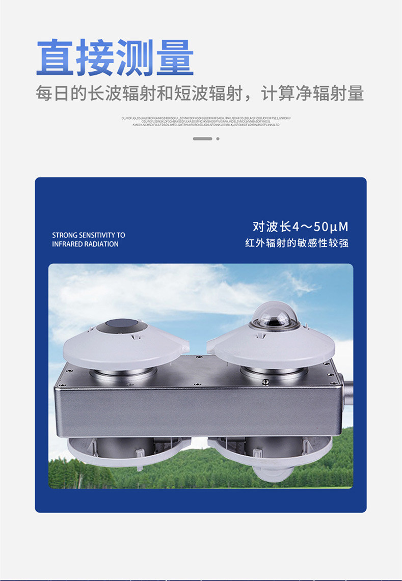 【产品简介】一、四分量净辐射传感器产品概述在气象应用中,红外辐射或者长波辐射指的是波长大于3.0μm的电磁辐射。长波辐射在物理上与温度有关,并且在地球上所有物体都会发出长波辐射。而太阳的短波辐···