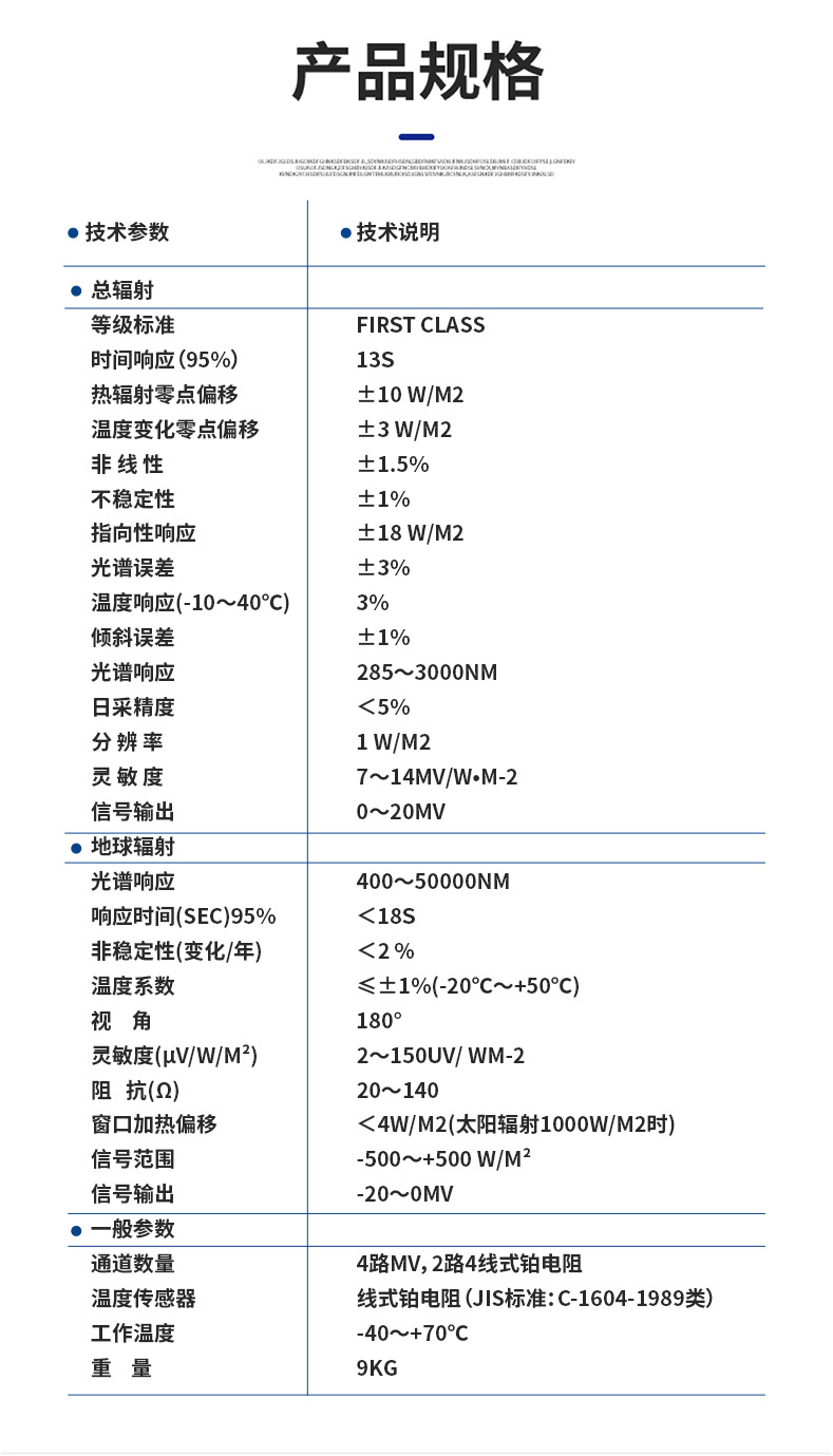 | 指向性响应 | ±18 W/m2 |