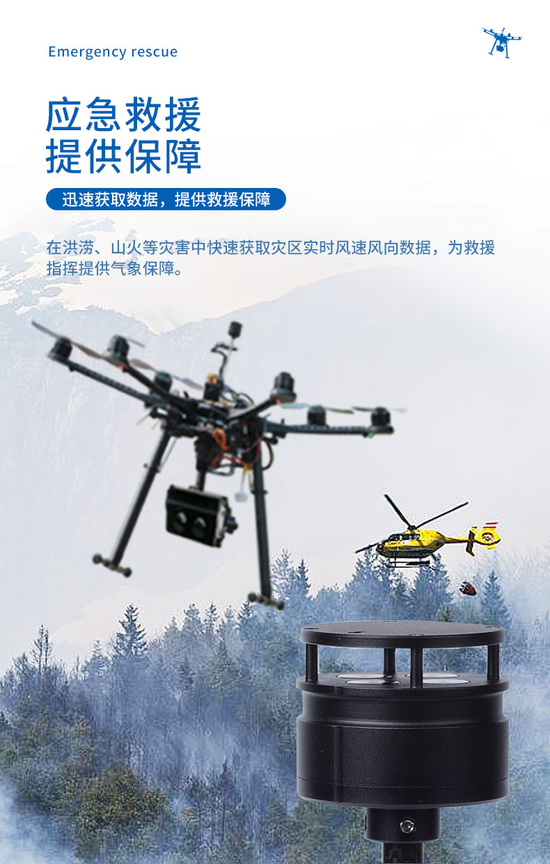 1.无人机风速风向仪仅重680/880克,专为无人飞机或小型无人巡检飞行器空中飞行状态下的能见度及其它气象数据监测和采集而设计;