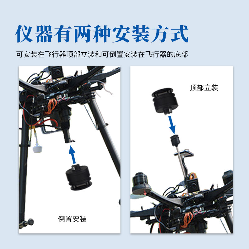 3.外形扁平风阻低,吊装在机腹部。用户可根据需要选择ABS和铝合金外壳材料,也可选装温湿度和气压传感器。仪器功耗仅为0.9瓦,非常适用于小型无人机平台,利用飞行器搭载进行低空环境气象要素巡检。