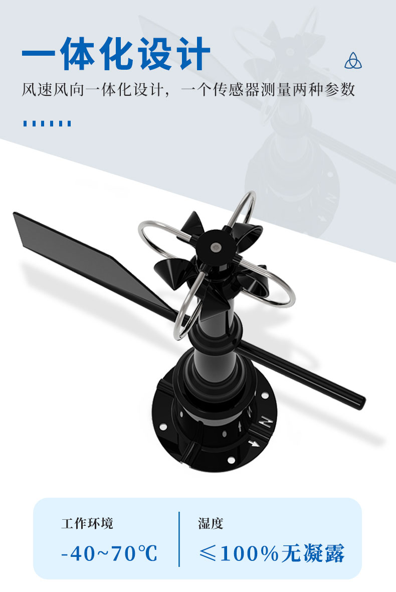 【产品简介】一、机械一体式风速风向传感器技术指标供电:DC12V工作环境:-40~70℃,湿度≤100%无凝露通信接口:RS485工作电流:55mA DC12V启动风速:0.5m/s最短数据间···