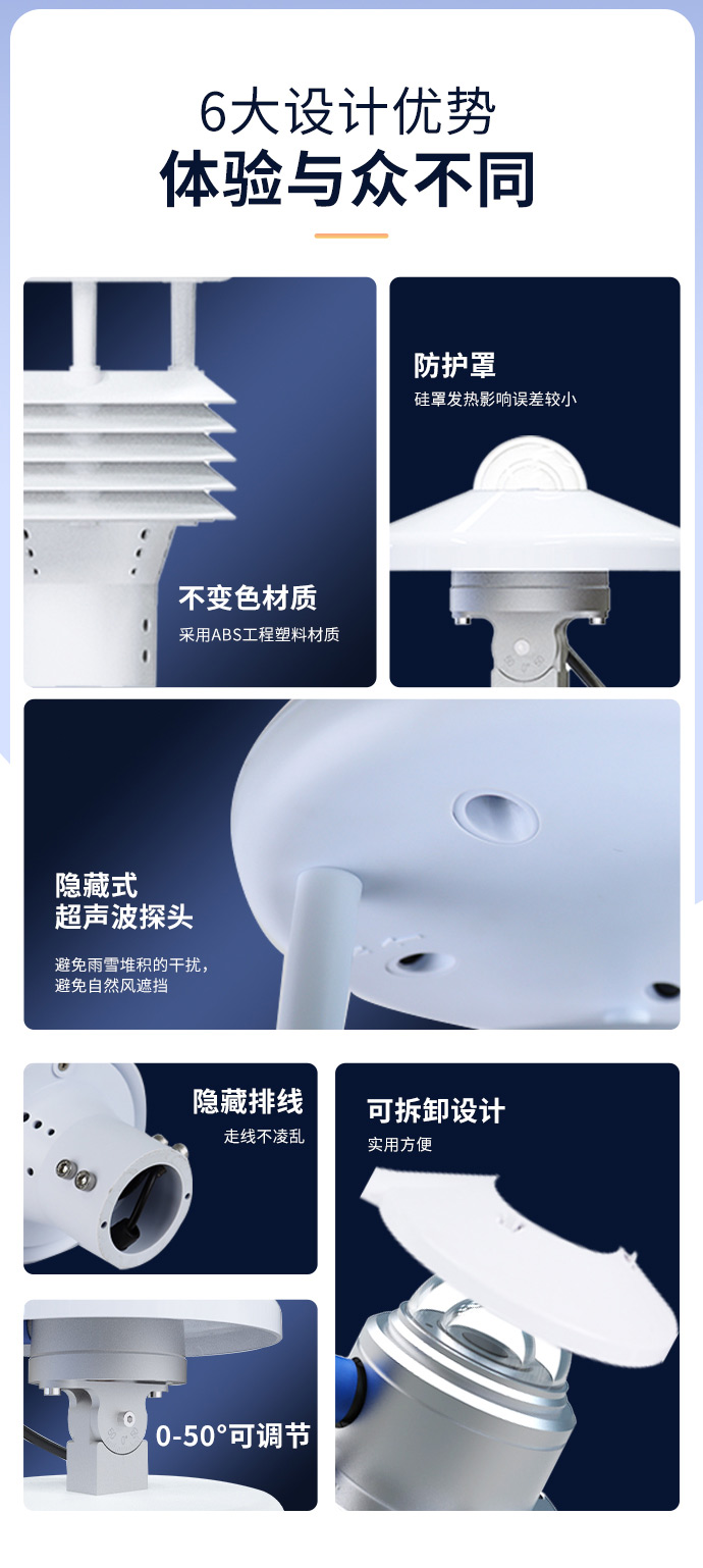 1、顶盖隐藏式超声波探头,避免雨雪堆积的干扰,避免自然风遮挡