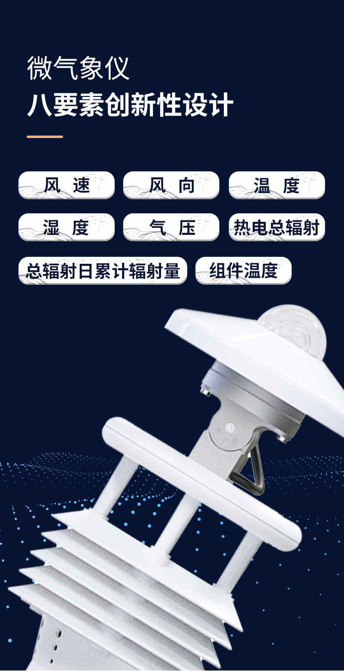 WQX8B型八要素微气象仪创新性地将风速、风向、温度、湿度、气压、热电总辐射、总辐射日累计辐射量、组件温度(背板温度)通过一个高集成度结构来实现,可实现户外气象参数24小时连续在线监测,通过数字量通讯接口将八项参数一次性输出给用户。