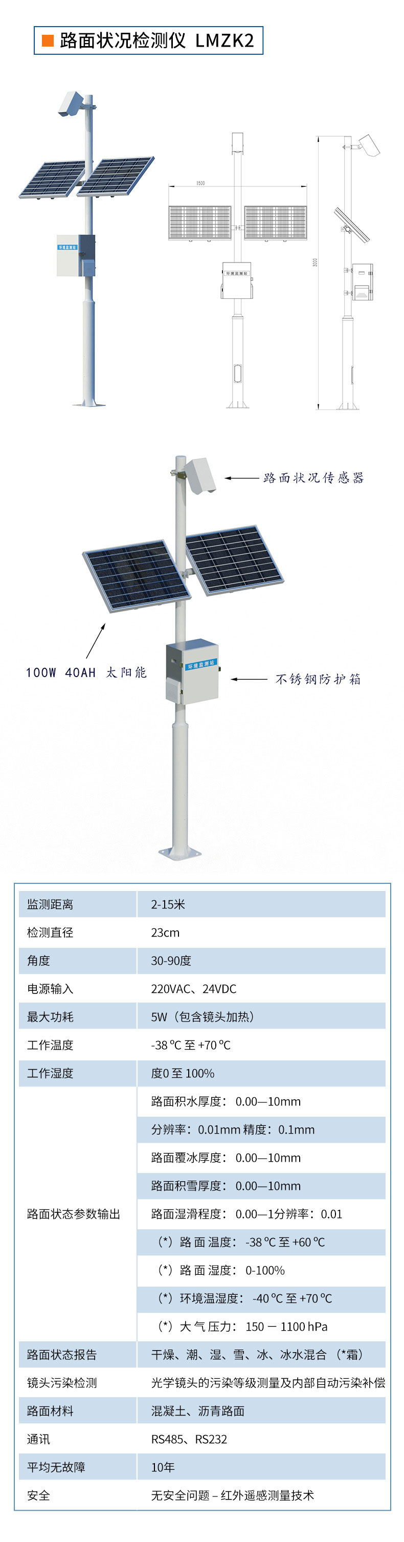 8米路面状况监测站采用遥感技术,避免了对道路的破坏,从而不会因为安装道路气象站引起的对交通的干扰。