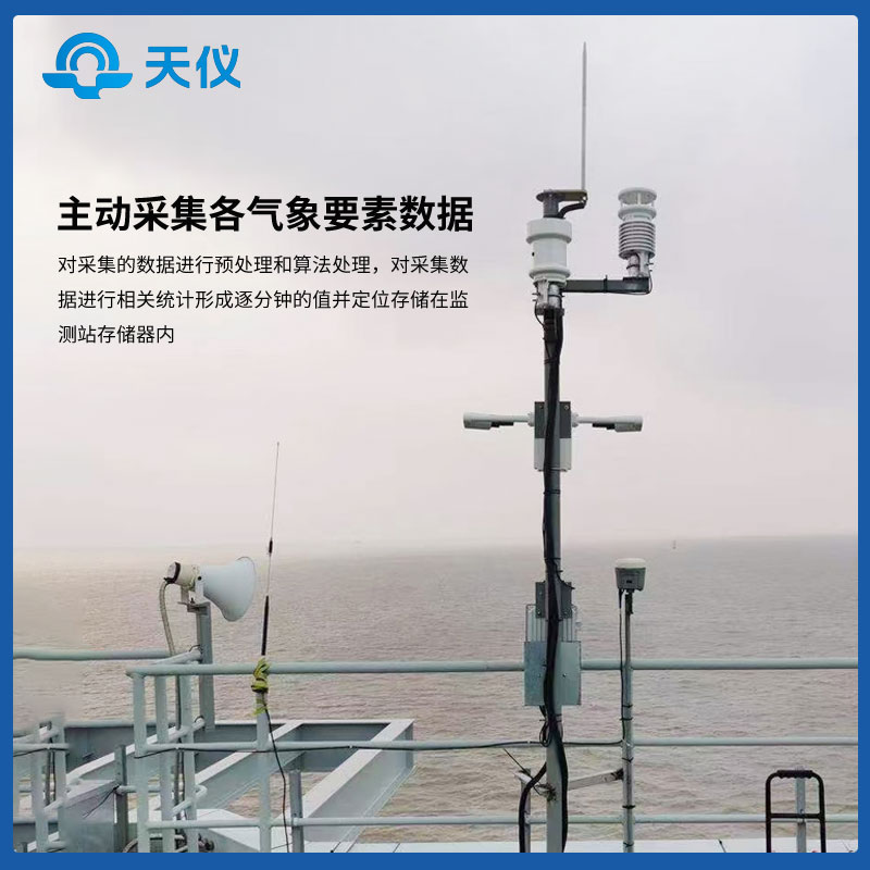 海洋气象站采用的气象传感器包括:能见度天气现象检测仪、风湿温压雨光照一体化微型气象站、北斗高精度定位仪等,还包括专用综合气象数据采集器、支撑结构、供电通信控制箱等单元。