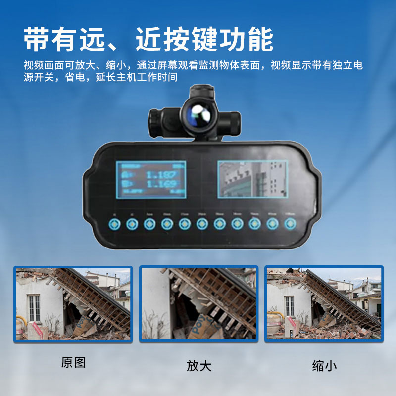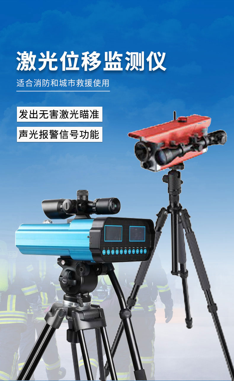 激光位移监测仪为忙于救援及灭火工作的消防官兵提供安全保障:采用无害激光,能够检测到由地震、炸弹、瓦斯爆炸等产生的危房及其它建筑结构(如:地板、地板砖、柱子、墙体)的任何细微的移动,是一种便携式自动装置,可在远距离连续监测任何不稳定结构或建筑物的轻微移动,主机发出无害激光瞄准,当物体发生1mm的移动即可立即出发报警,发出声光报警信号,从而保证救援人员安全。