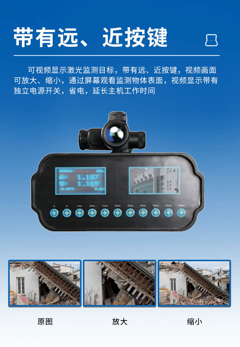 2.可视频显示激光监测目标,带有远、近按键,视频画面可放大、缩小,通过屏幕观看监测物体表面,视频显示带有独立电源开关,省电,延长主机工作时间
