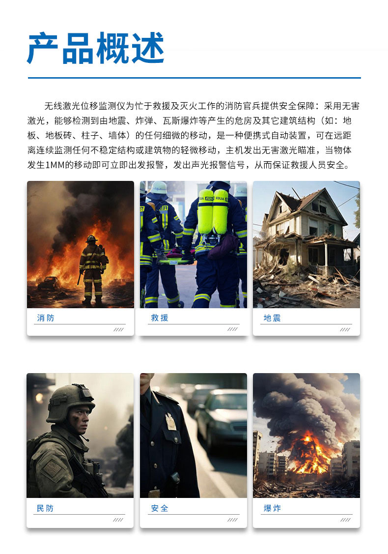 1.探测最轻微的不稳定结构的移动,以提醒救援人员可能发生的倒塌,创建安全区域;
