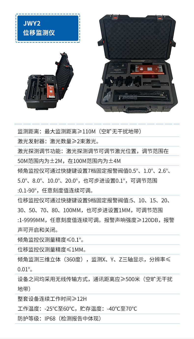 【产品简介】一、激光位移监测仪产品介绍激光位移监测仪为忙于救援及灭火工作的消防官兵提供安全保障:采用无害激光,能够检测到由地震、炸弹、瓦斯爆炸等产生的危房及其它建筑结构(如:地板、地板砖、柱子···