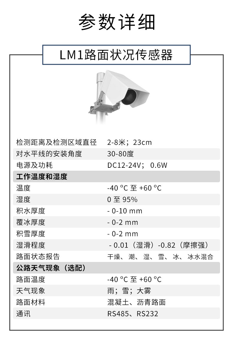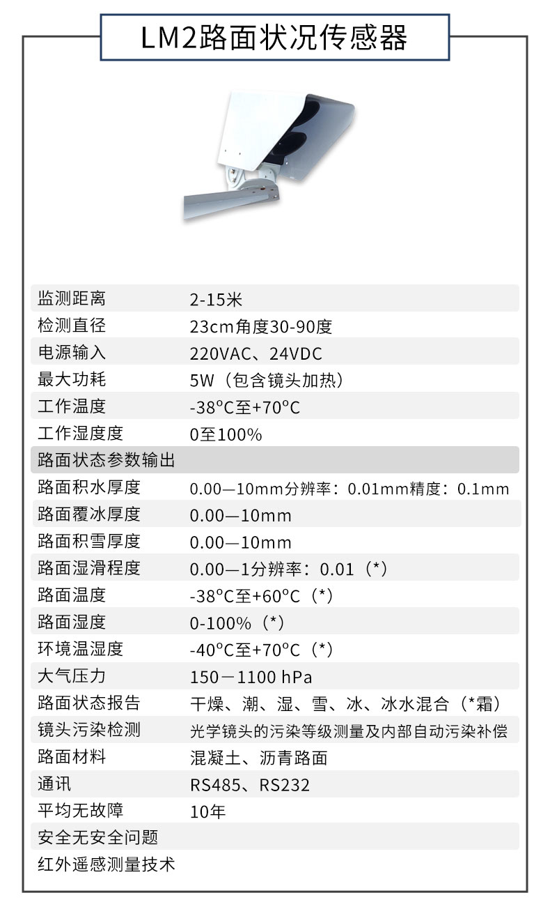 LM2是一款非接触式路面传感器,它采用遥感技术,避免了对道路的破坏,从而不会因为安装道路气象站引起的对交通的干扰。多光谱测量技术使得能准确检测道出道路表面结冰、积雪和积水的厚度。在埋入式路面传感器不便或不能安装的路面条件下,LM2检测器是最理想的选择。遥感安装,意味着不需要封闭道路、不需要切割路面,安装工作既安全又方便。维护量少,是道路气象系统组成中一项理想选择。它既可以安装在现有的气象站上,也可以安装在路面视野无遮挡的其他建筑物上。