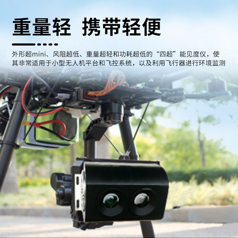 1.无人机用能见度检测仪仅重110克,专为无人飞机或小型无人巡检飞行器空中飞行状态下的气象数据监测和采集而设计;
