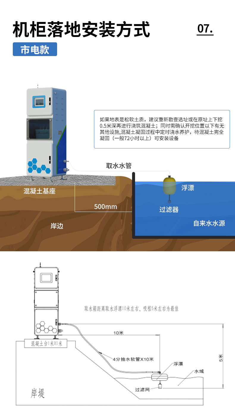 注意:传感器安装时不能倒置或者水平安装,至少倾斜15度角以上安装,以上水质传感器工作环境0-50℃,<0.3Mpa