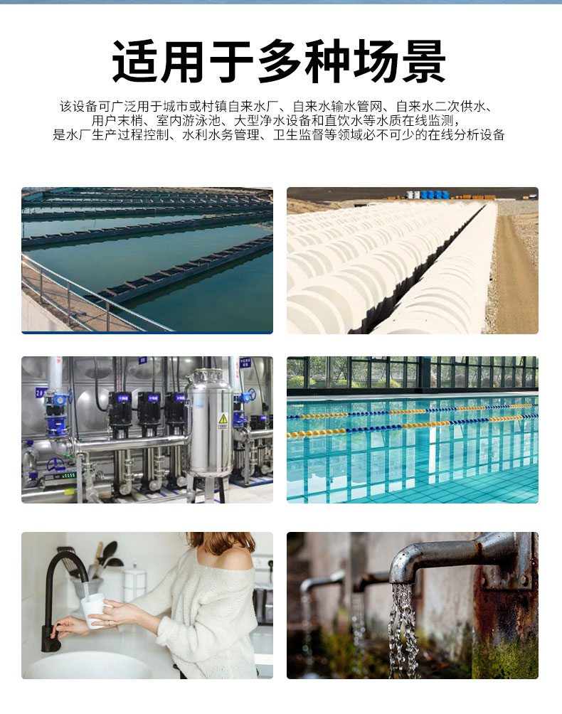 水质三参数监测仪可广泛用于河流、城市或村镇自来水厂、自来水输水管网、自来水二次供水、用户末梢、室内游泳池、大型净水设备和直饮水等水质在线监测,是水厂生产过程控制、水利水务管理、卫生监督等领域必不可少的在线分析设备。