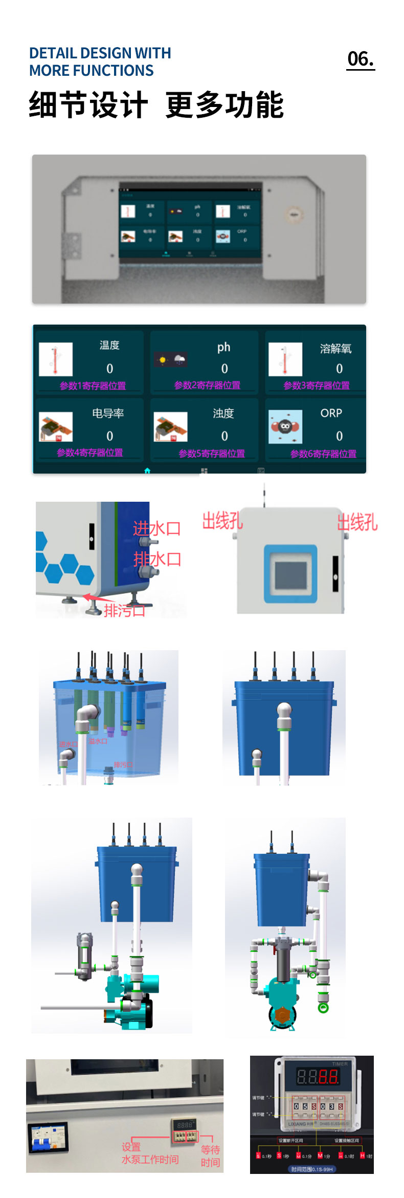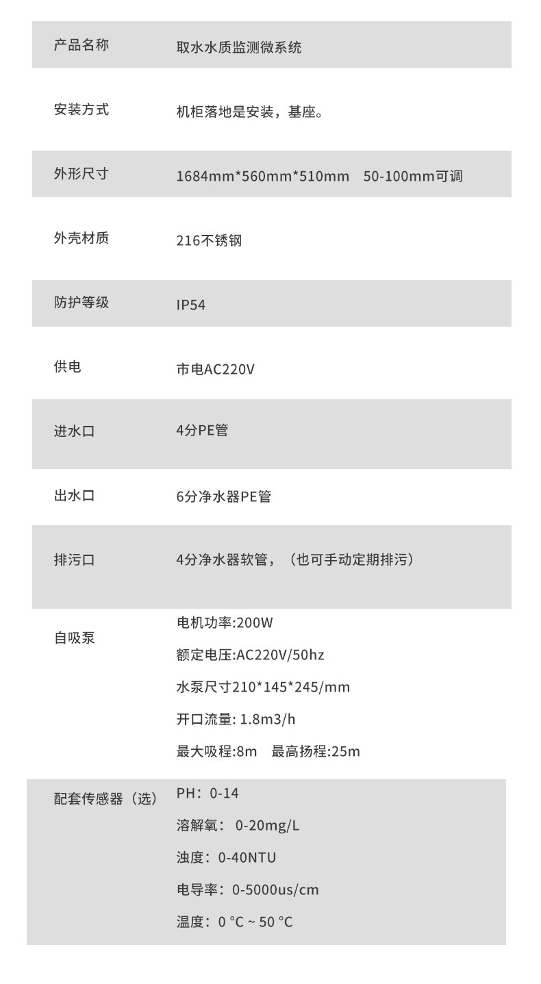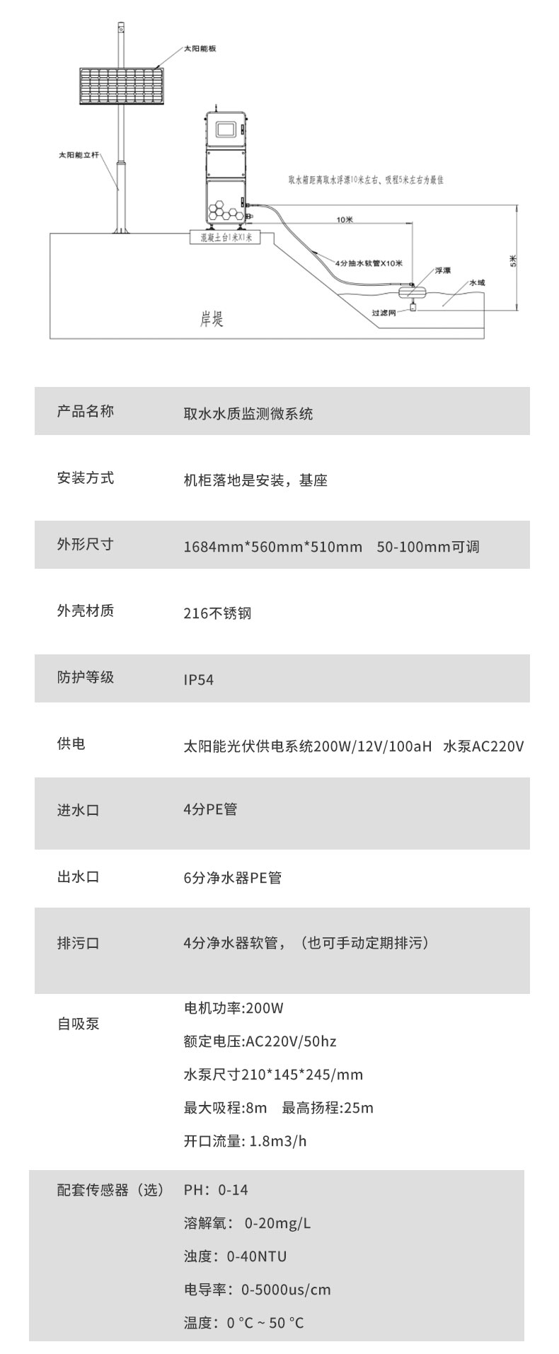 | 配套传感器(选) | PH:0-14溶解氧:0-20mg/L浊度:0-40NTU电导率:0-5000us/cm温度:0°C~50°C |