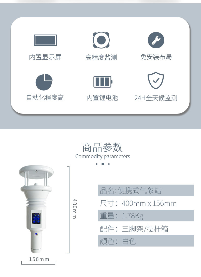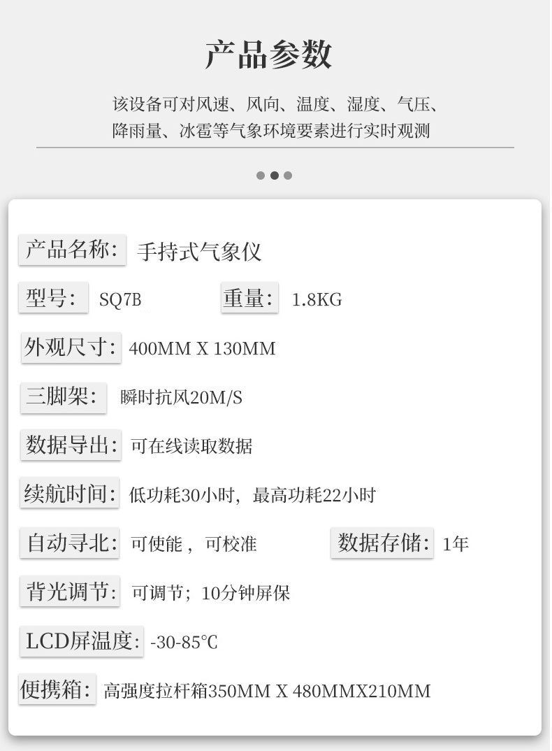 【产品简介】一、七要素超声波手持气象站产品简介七要素超声波手持气象站对风速、风向、温度、湿度、气压、降雨量、冰雹等气象环境要素进行实时观测,可实现户外气象参数24小时连续在线监测,其中自带显示···
