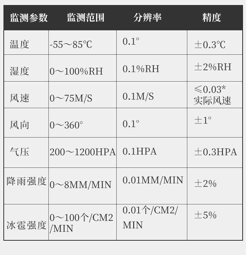 | 7 | 冰雹强度 | 0~100个/cm2/min | 0.01个/cm2/min | ±5% | |