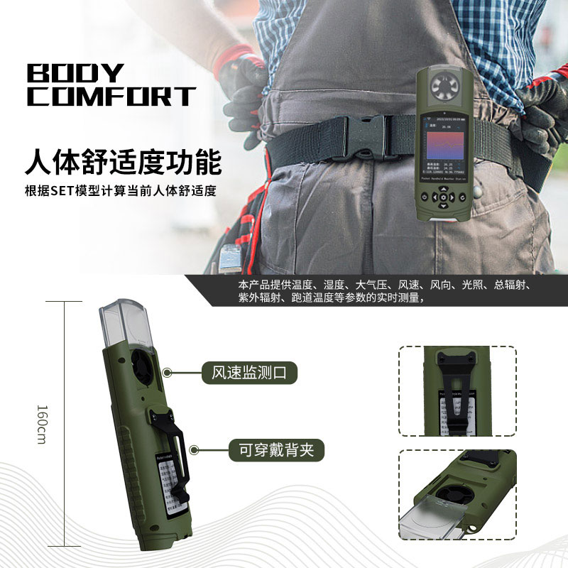 【产品简介】一、袖珍气象仪产品简介本产品提供温度、湿度、大气压、风速、风向、光照、总辐射、紫外辐射、跑道温度等参数的实时测量。并具备户外的SOS求救、电子罗盘、跑道温度、未来3小时天气预报、人···