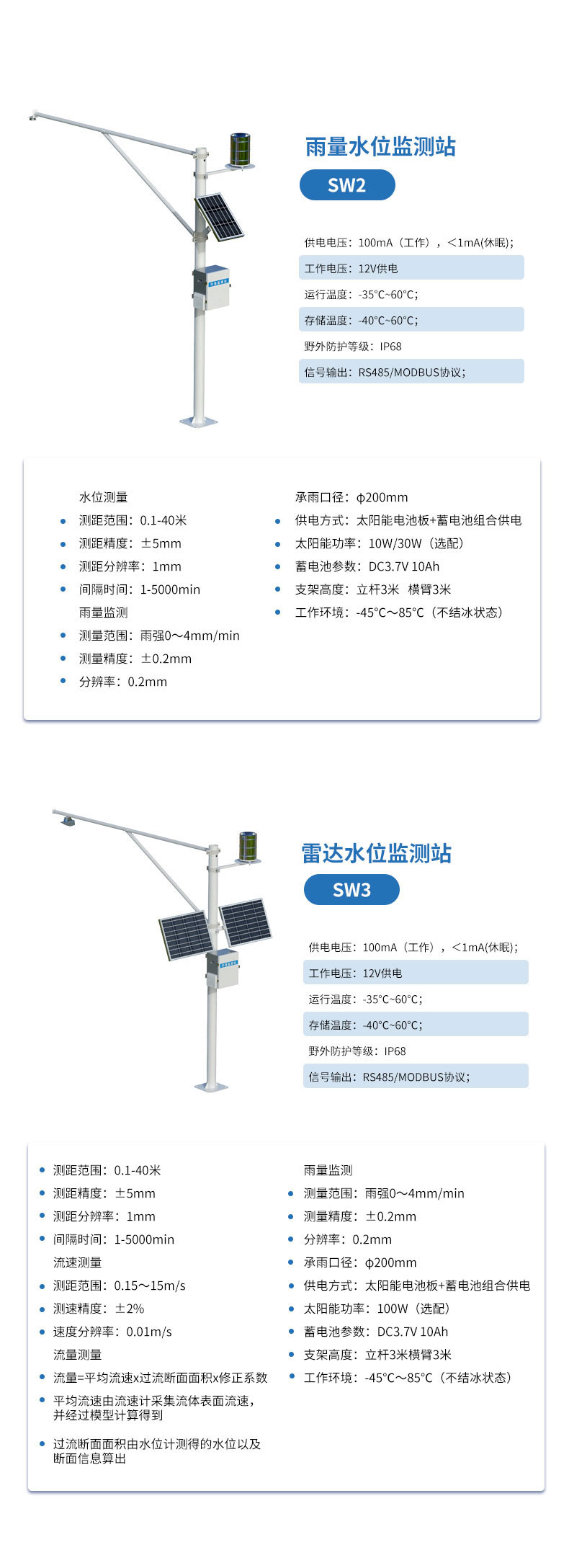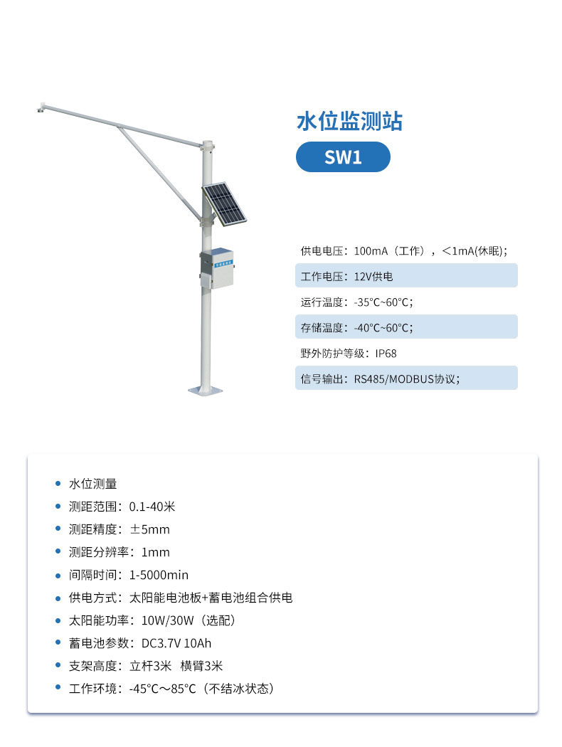 【产品简介】一、水位监测站产品概述SW1是一款基于微波技术的全自动水文在线监测系统,可同时测量渠道内水位。它采用先进的K波段平面雷达技术,通过非接触的方式测量水体的水位,根据内置的软件算法,计···