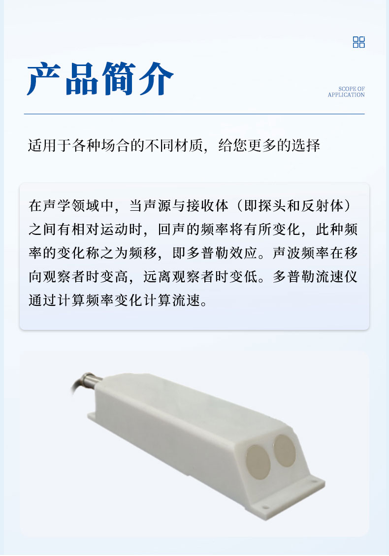 【产品简介】一、多普勒流速传感器产品原理在声学领域中,当声源与接收体(即探头和反射体)之间有相对运动时,回声的频率将有所变化,此种频率的变化称之为频移,即多普勒效应。声波频率在移向观察者时变高···