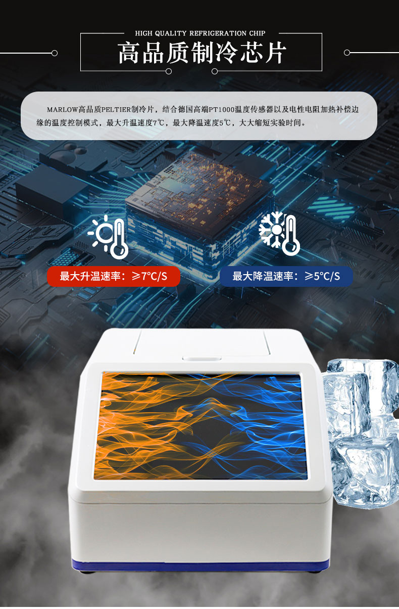7.Marlow高品质Peltier制冷片,结合德国高端PT1000温度传感器以及电性电阻加热补偿边缘的温度控制模式,最大升温速度7℃,最大降温速度5℃,大大缩短实验时间。