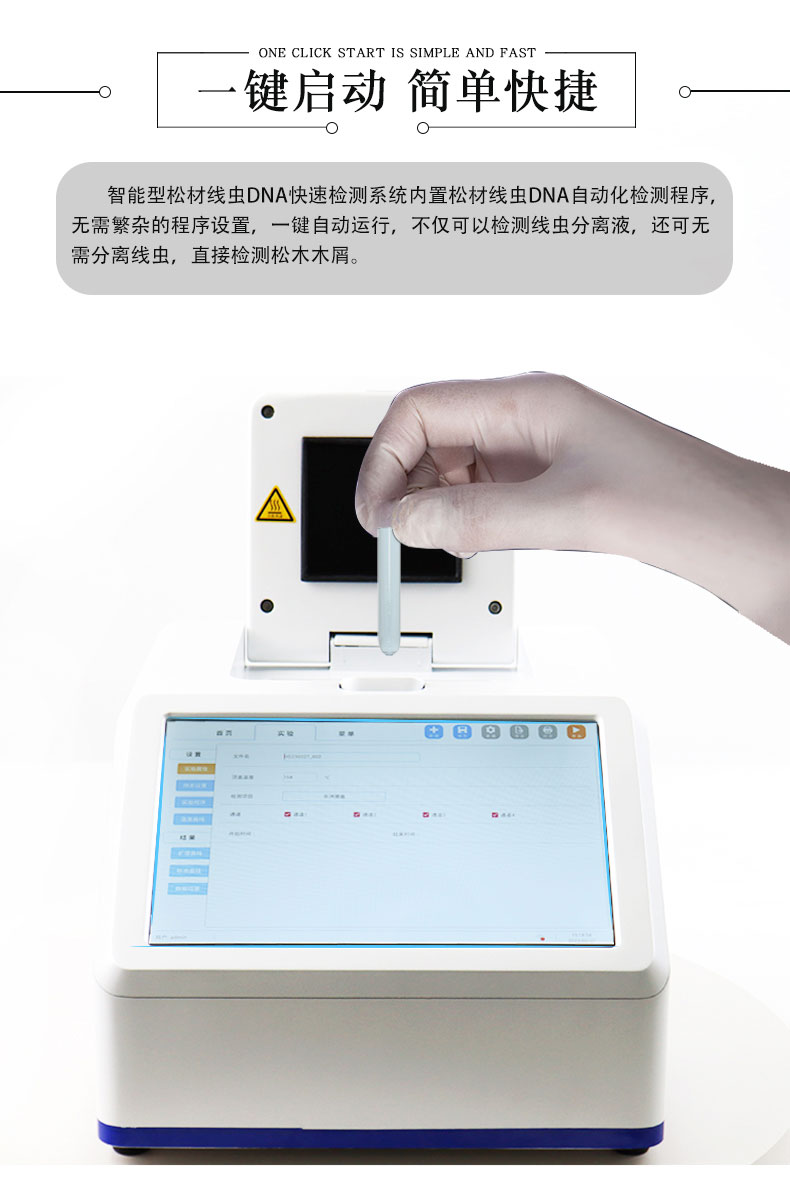2.智能型松材线虫DNA快速检测系统内置松材线虫DNA自动化检测程序,无需繁杂的程序设置,一键自动运行,不仅可以检测线虫分离液,还可无需分离线虫,直接检测松木木屑。