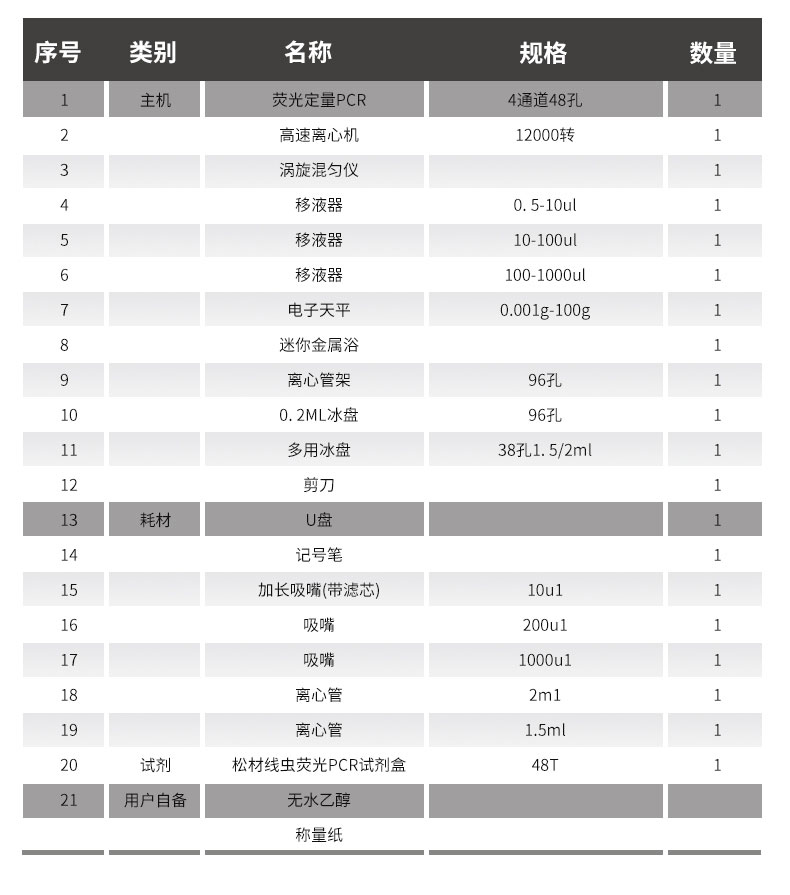 | 20 | 试剂 | 松材线虫荧光PCR试剂盒 | 48T | 1 |