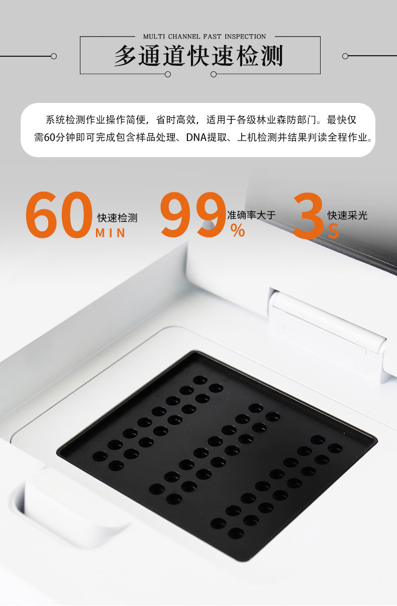 3.系统检测作业操作简便,省时高效,适用于各级林业森防部门。最快仅需60分钟即可完成包含样品处理、DNA提取、上机检测并结果判读全程作业。