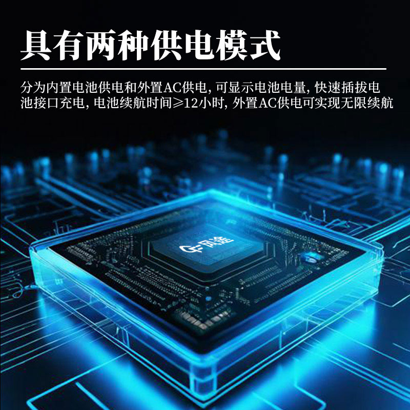 18、供电配置:供电箱具有两种供电模式,分别为内置电池供电和外置AC供电,供电箱可显示电池电量,可快速插拔电池接口充电,电池续航时间≥12小时,外置AC供电可实现无限续航。