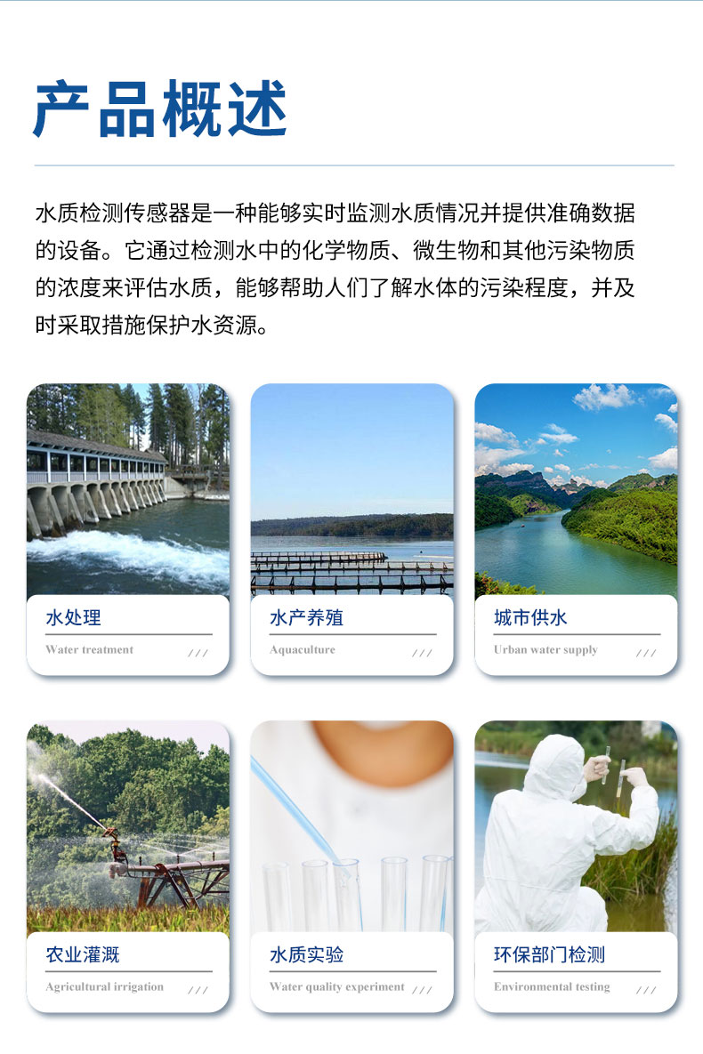 【产品简介】一.水质透明度温度传感器应用环境说明利用光的散射或吸收特性来测量水中透明度。具有高灵敏度、快速响应和实时监测能力,在水质监测和污水处理等领域有着广泛应用。信号输出:RS485(MO···
