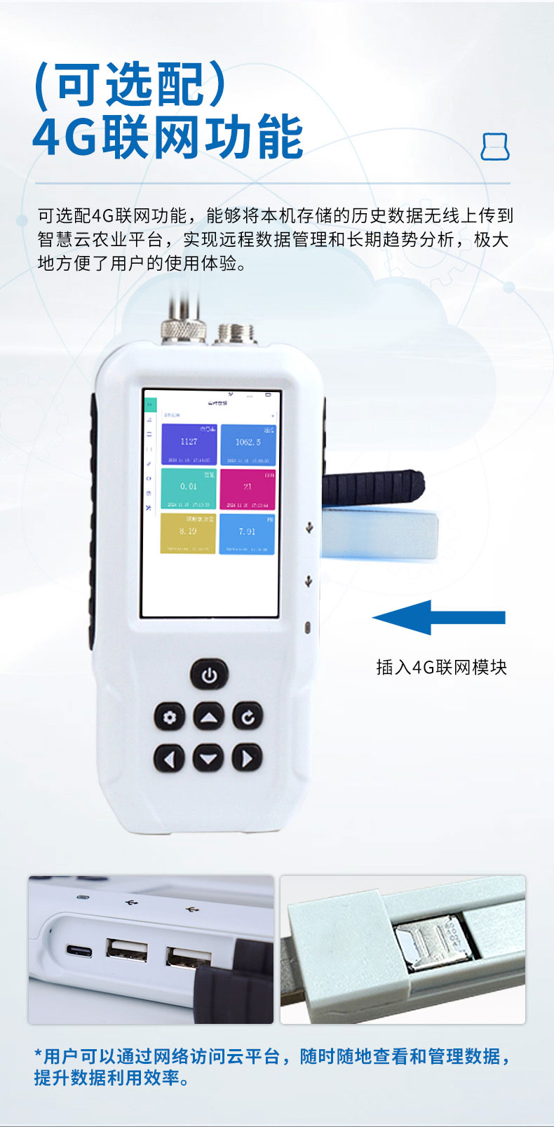 7.无线上传至云平台:可选配4G联网功能,能够将本机存储的历史数据无线上传到智慧云农业平台,实现远程数据管理和长期趋势分析,极大地方便了用户的使用体验。