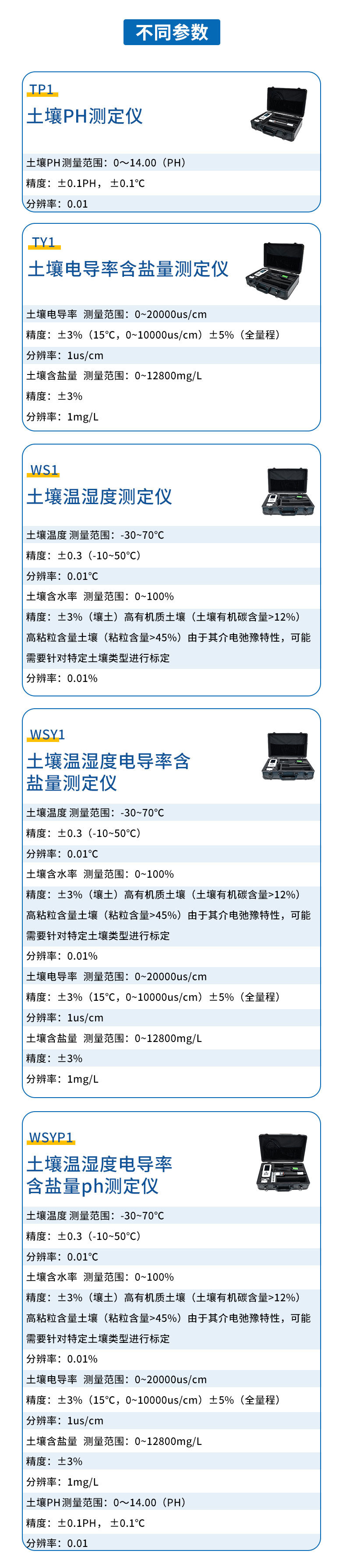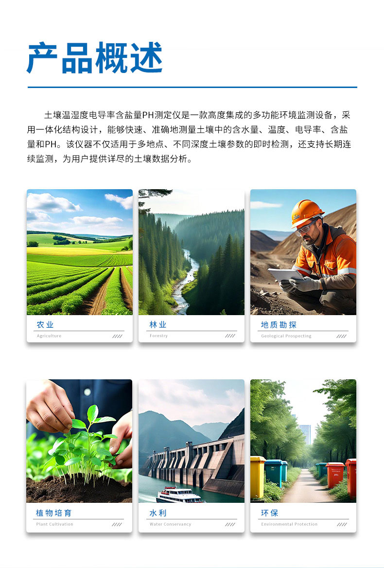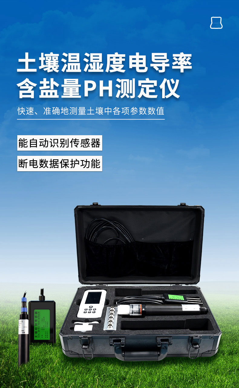 【产品简介】一、土壤温湿度电导率含盐量PH测定仪产品简介土壤温湿度电导率含盐量PH测定仪是一款高度集成的多功能环境监测设备,采用一体化结构设计,能够快速、准确地测量土壤中的含水量、温度、电导率···