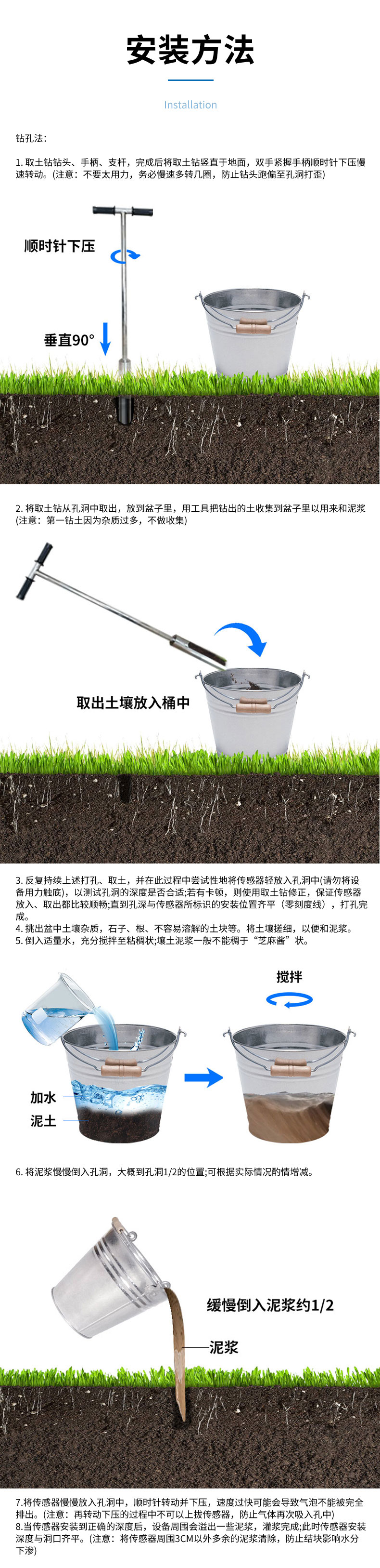 8.当传感器安装到正确的深度后,设备周围会溢出一些泥浆,灌浆完成;此时传感器安装深度与洞口齐平。(注意:将传感器周围3CM以外多余的泥浆清除,防止结块影响水分下渗)
