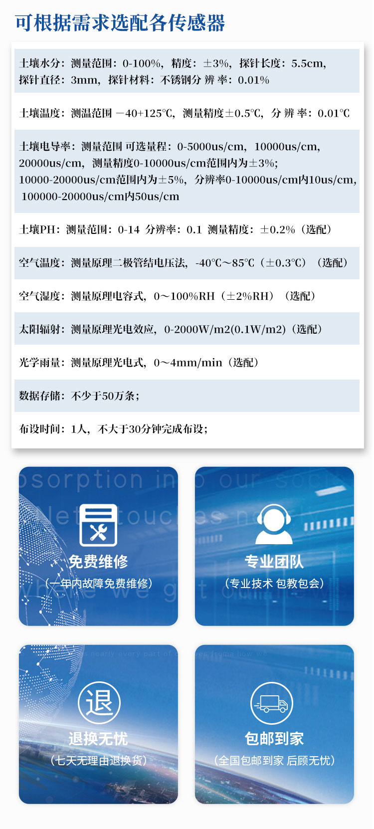 1)土壤水分:测量范围:0-100%,精度:±3%,探针长度:5.5cm,探针直径:3mm,探针材料:不锈钢分辨率:0.01%