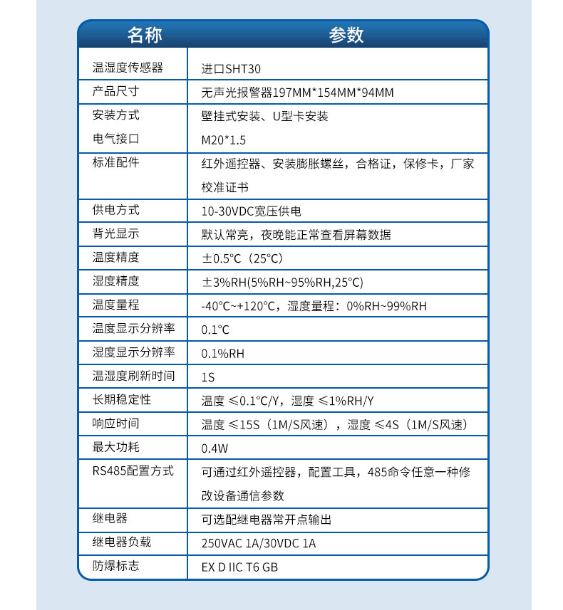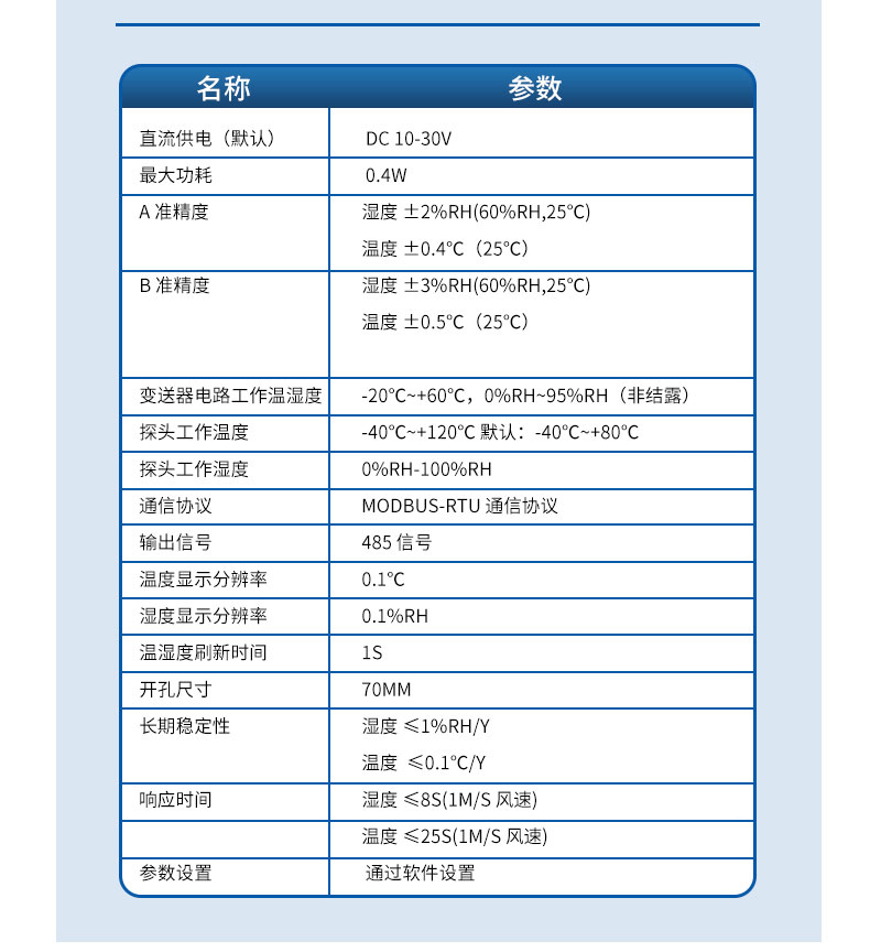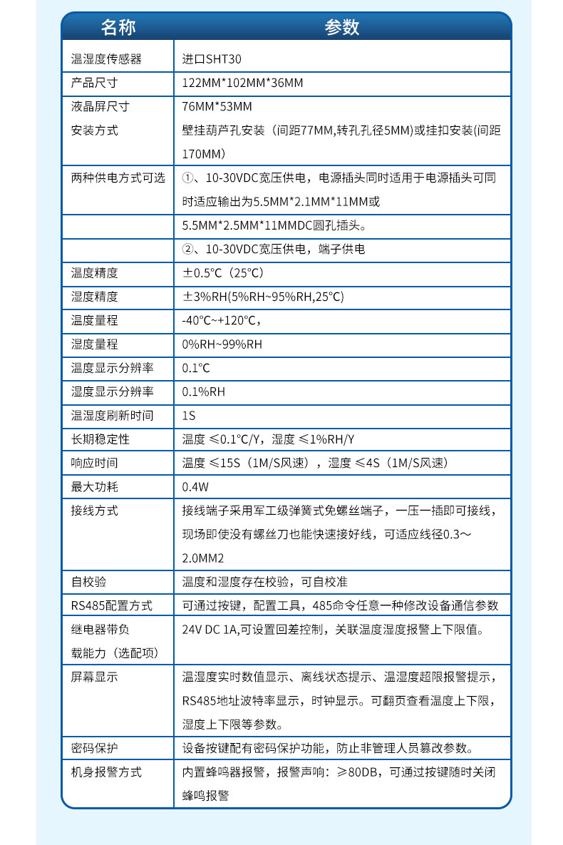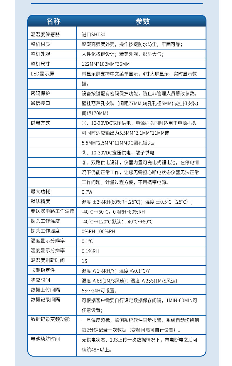 温湿度采集频率 2S/次,数据上传频率 1S~10000S/次可设