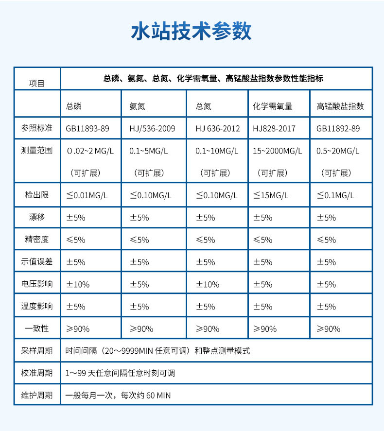 | 项目 | 总磷、氨氮、总氮、化学需氧量、高锰酸盐指数参数性能指标 | ||||