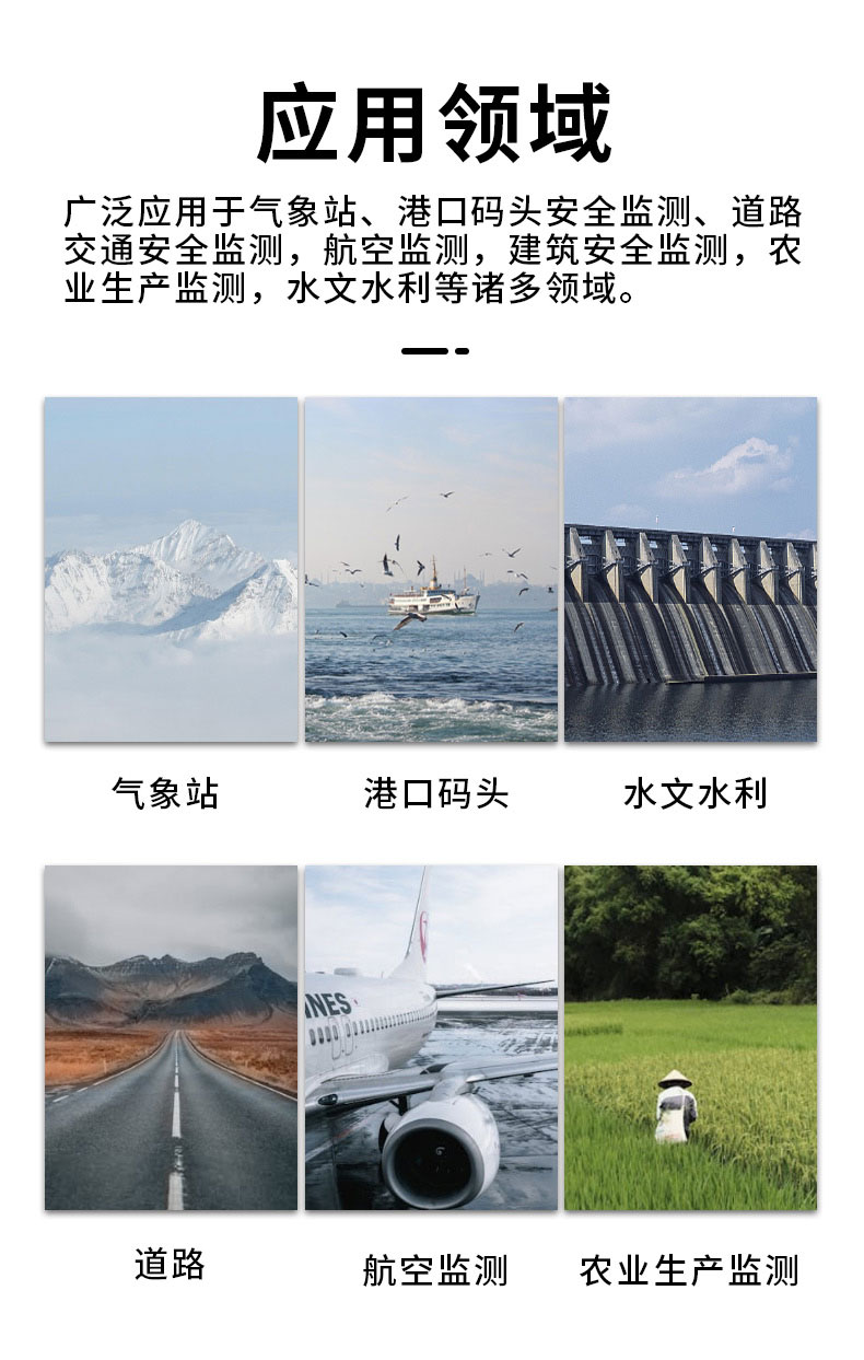 应用范围:广泛应用于气象站、港口码头安全监测、道路交通安全监测,航空监测,建筑安全监测,农业生产监测,水文水利等诸多领域。