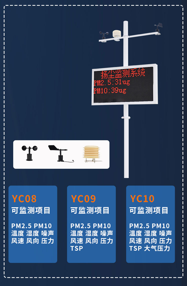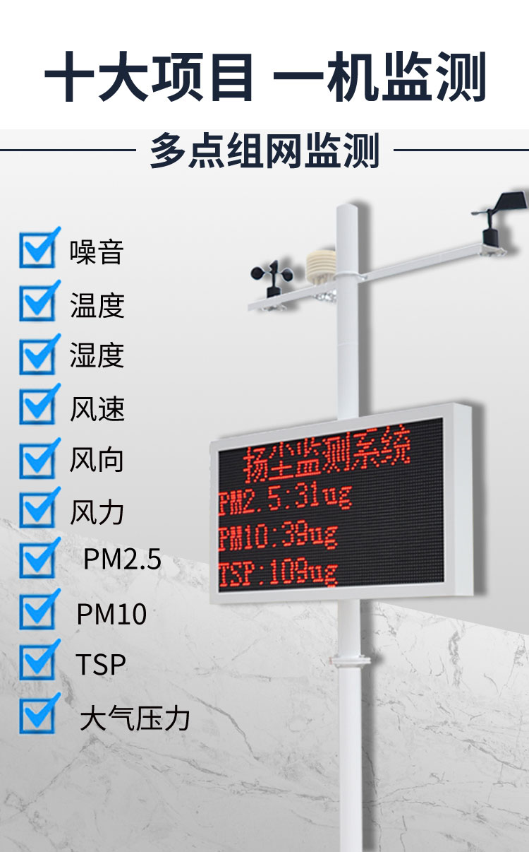 我公司为改善空气质量利用无线传感器技术和激光粉尘测试设备,自主研发的扬尘监测设备,除了可以实现扬尘监控以外,还可以监测PM2.5、PM10,PM1.0、TSP、噪声、环境温度,环境湿度,风速、风向等环境因子,各测试点的测试数据通过无线通讯直接上传到监测后台,大大节省了环保部门监测成本,提高监测效率。