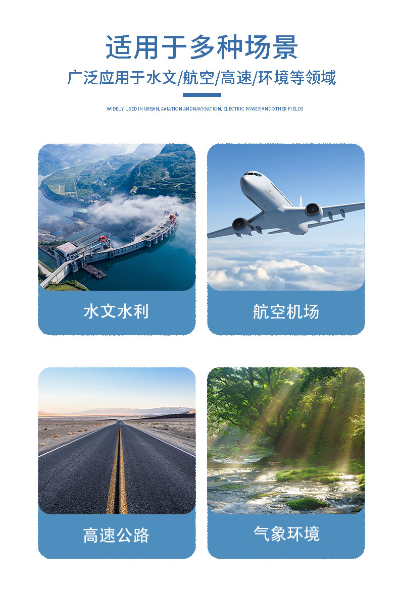 压电雨量监测站可广泛地应用于气象、防汛、农业、水文水利、环保、高速公路、机场和港口等领域。既可为气象台(站)、水文站、农林、国防、野外测报站等有关部门测量降水量、降水强度、降水时间等参数提供原始数据;也可为防洪、供水调度、电站、水库水情管理提供有参考价值的实时数据。