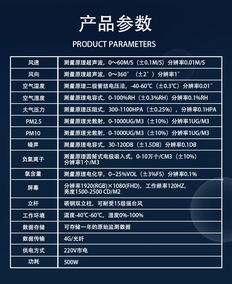 1、风速:测量原理超声波,0~60m/s(±0.1m/s)分辨率0.01m/s