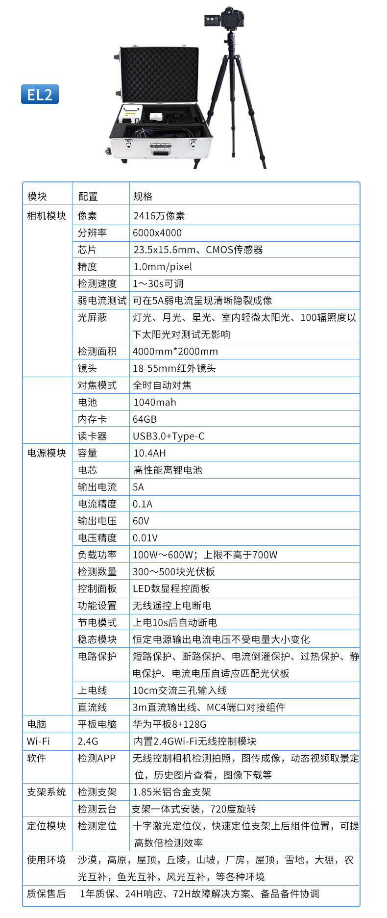 【产品简介】el检测仪产品简介: el检测仪应用于光伏太阳能电池板的内部缺陷检测,可跟高的帮助用户完成产品质量检测把控生产与安装风险,el检测仪搭载2000万级红外相机可有效帮助用户完成光伏板···