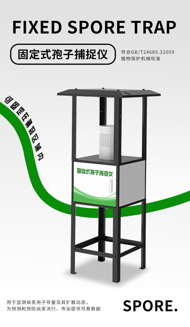 主要功能:可固定在测报区域内,定点观察特定区域孢子种类及数量,用于监测病害孢子存量及其扩散动态,为预测和预防病害流行、传染提供可靠数据,是农业植保部门应当配备的农作物病害检测专用设备。