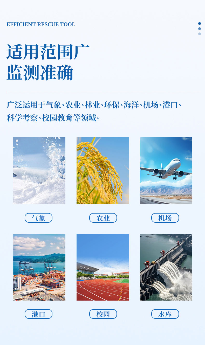 该设备免调试,可快速布置,广泛运用于气象、农业、林业、环保、海洋、机场、港口、科学考察、校园教育等领域。