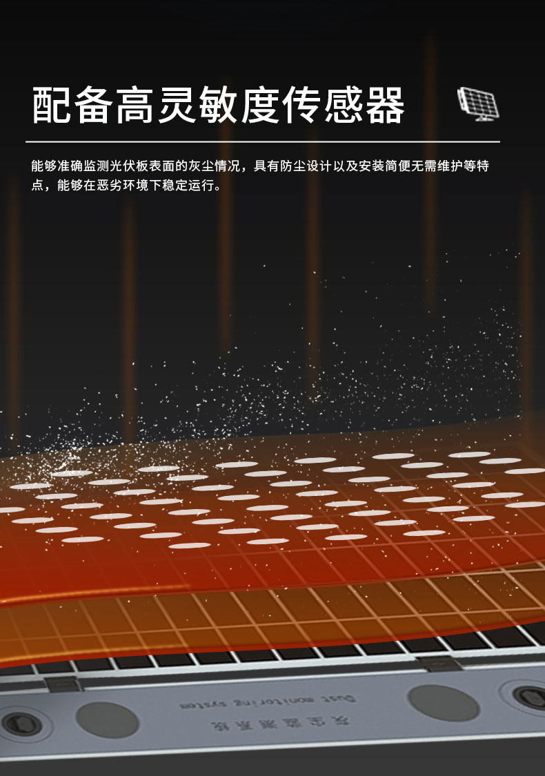 主要功能:灰尘监测系统,主要用于光伏设备的灰尘监测使用,帮助光伏设备做到灰尘的实时监控、远程监控,在光伏板表面洁净度不足时,提示用户及时清理,用以降低能源损耗,提升发电效率。